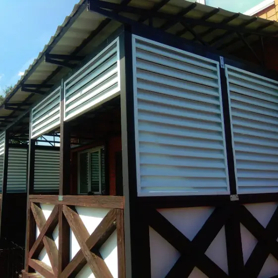 Элегантная беседка с интересным дизайном, отделанная ламелями Еврожалюзи в изысканном белом цвете RAL9003 полиэстер двусторонний. Такая отделка придаёт конструкции лёгкость и визуальную чистоту, гармонично вписываясь как в классический ландшафт, так и в современное архитектурное окружение. Светлый оттенок подчёркивает геометрию фасада, а двустороннее исполнение обеспечивает безупречный вид как снаружи, так и изнутри. Беседка не только украшает участок, но и создаёт уютное пространство для отдыха в любое время года.